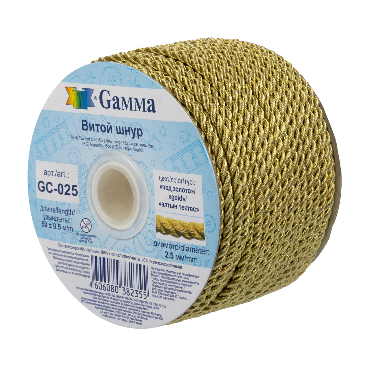 Шнур Gamma 2.5 мм GC-025 витой 50 м ± 0.5 м под золото. В интернет-магазине АВАНТИ широкий ассортимент товаров, быстрая доставка и регулярные скидки.